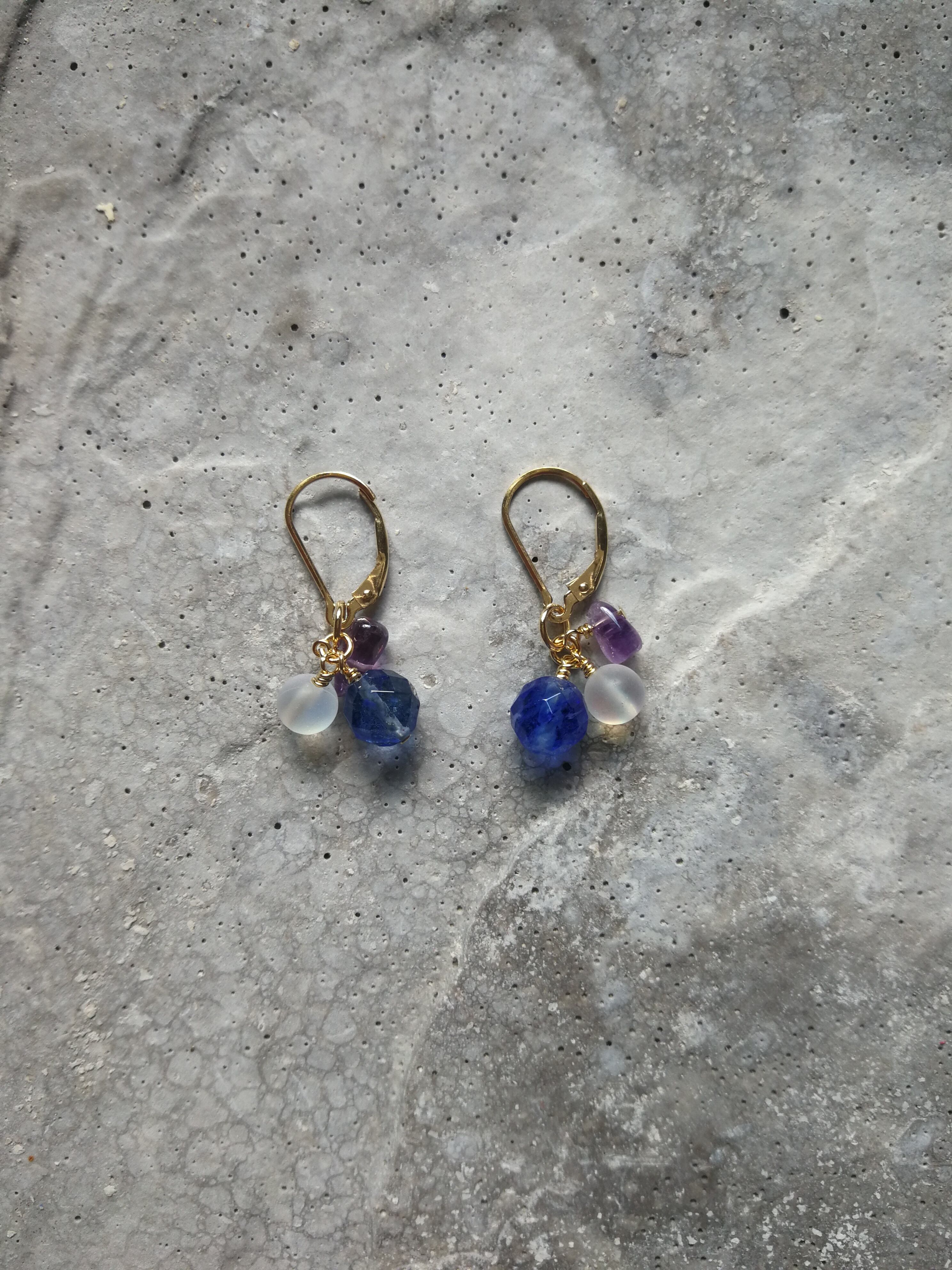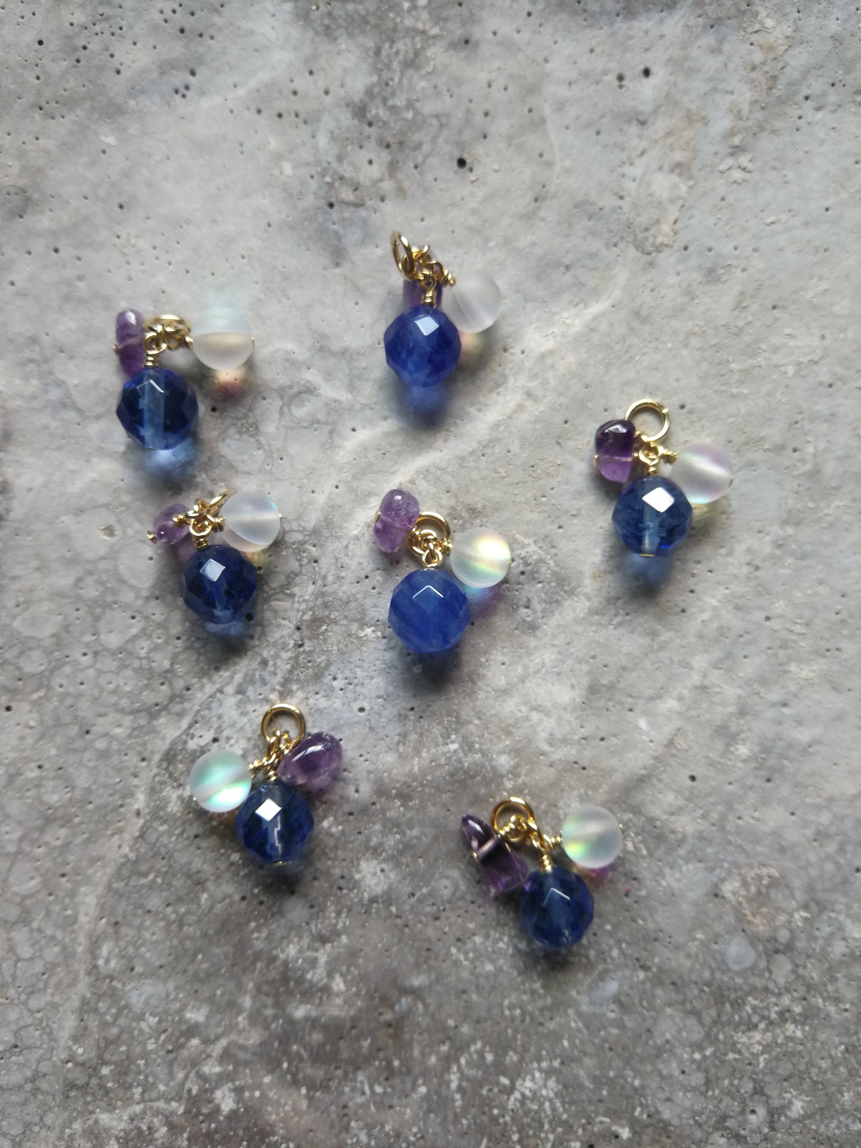 素材/ブルーベリークォーツ(人工石)、アメジスト、フロストルナフラッシュ(人工石)、真鍮